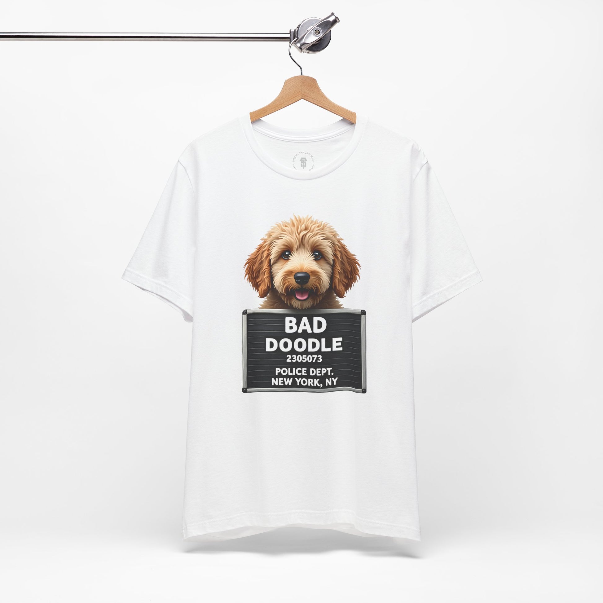 This hilarious Bad Goldendoodle mugshot T-shirt is perfect for those who know their little Goldendoodle is guilty of mischief!