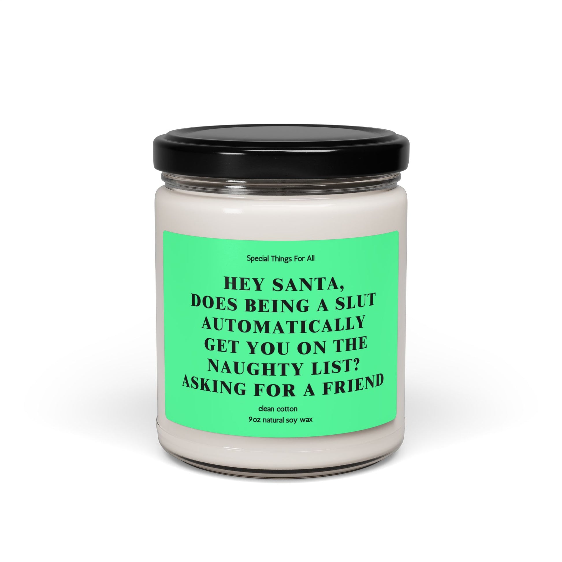 This scented soy candle is a funny Christmas holiday gift with the message "Hey Santa, Does Being A Slut Automatically Get You On the Naughty List Glass Candle" for those with adult humor.
