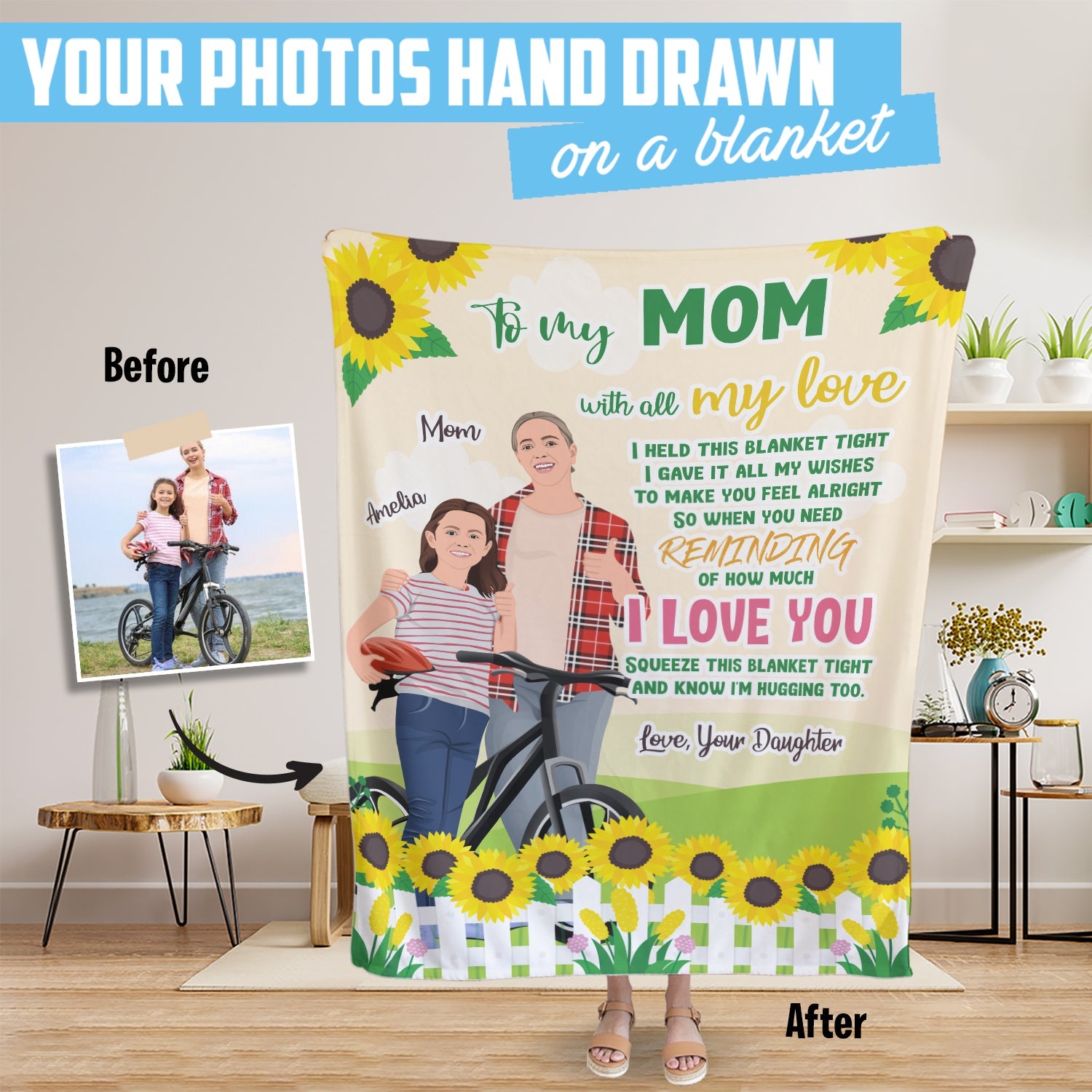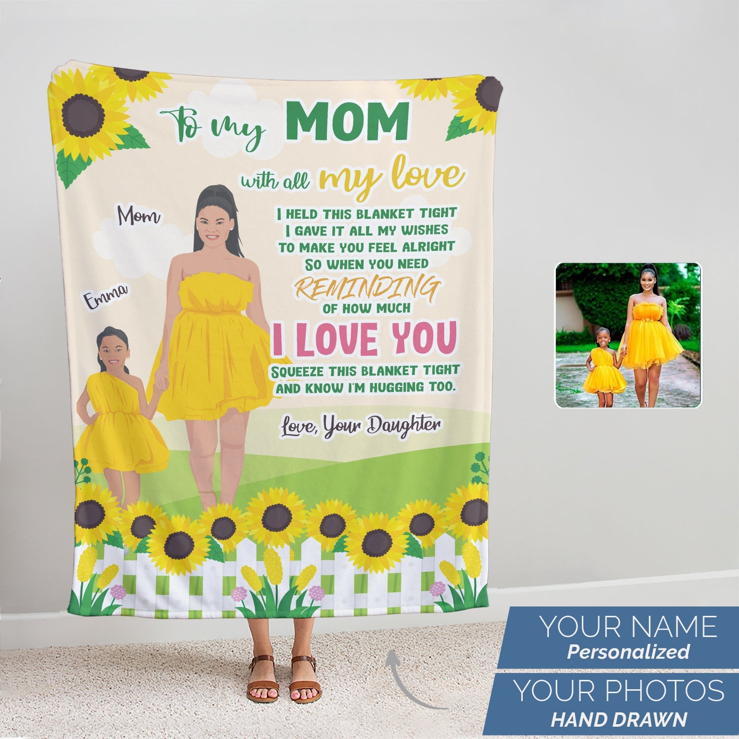 Surprise your mother with a one-of-a-kind blanket that features a drawing of her, made just for her! Printed on high quality fleece or sherpa, this unique gift is sure to make her feel loved.