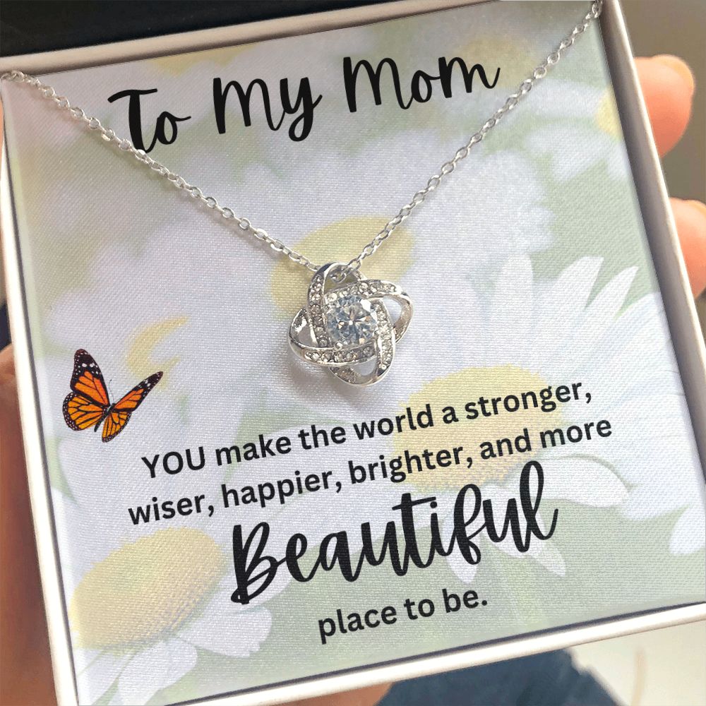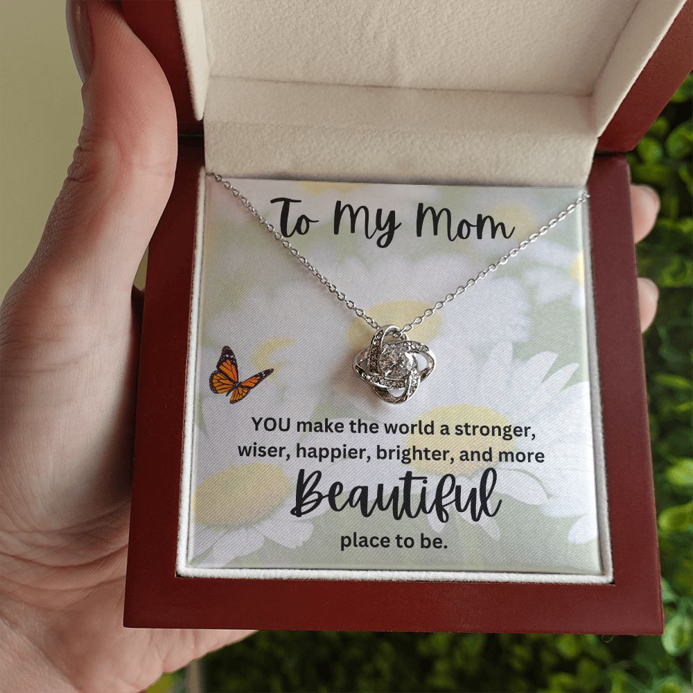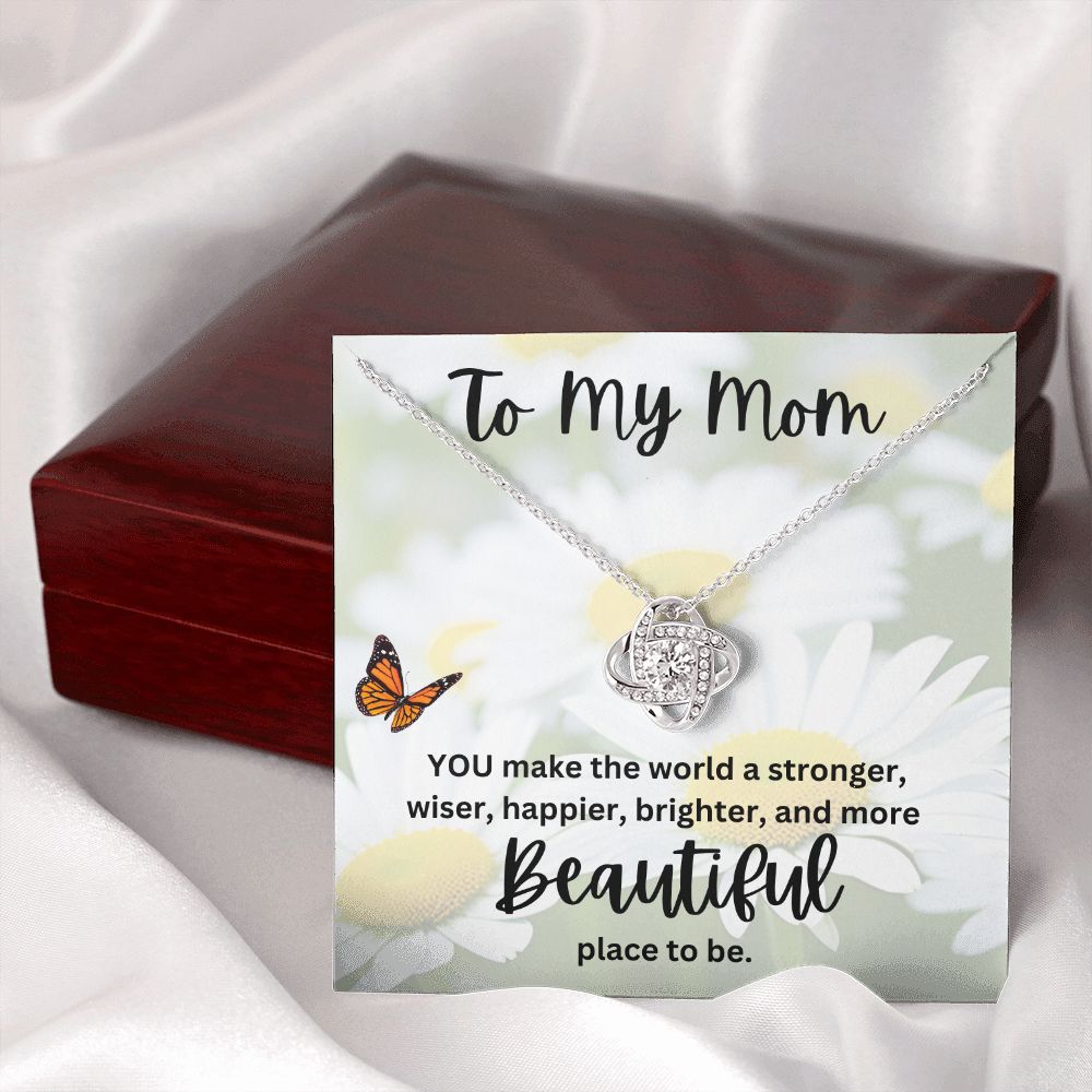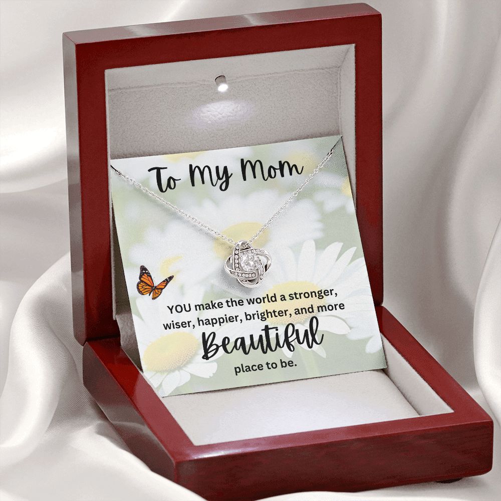 But this necklace is more than just a beautiful accessory - it's a symbol of your unbreakable bond. The love knot design represents the strength and enduring nature of your relationship, making it the perfect gift for any occasion. Plus, with the included soft touch box, you can easily present it to her in style. Upgrade to the mahogany luxury box for an extra touch of sophistication, complete with a dazzling LED spotlight. Surprise her with this gorgeous gift today and show her just how much you care.